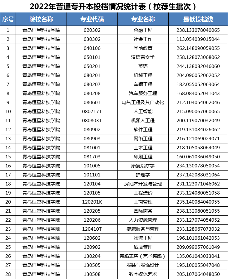 我校2022年普通统专升本录取工作已顺利结束。专升本生源质量较好,各专业投档分数大幅度超出最低控制分数线,校荐生录取计划全部完成,自荐生另列计划,录取分数线按照校荐生投档最低分数线执行。
