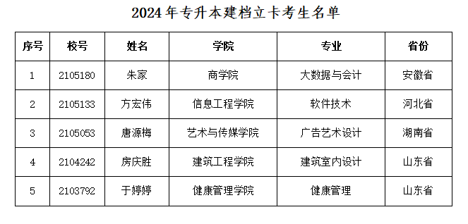根据山东省教育厅《关于做好2024年普通高等教育专科升本科考试招生工作的通知》鲁招考〔2023〕128号要求,经学生本人申请,我校审核,现将符合条件的建档立卡考生名单予以公示。