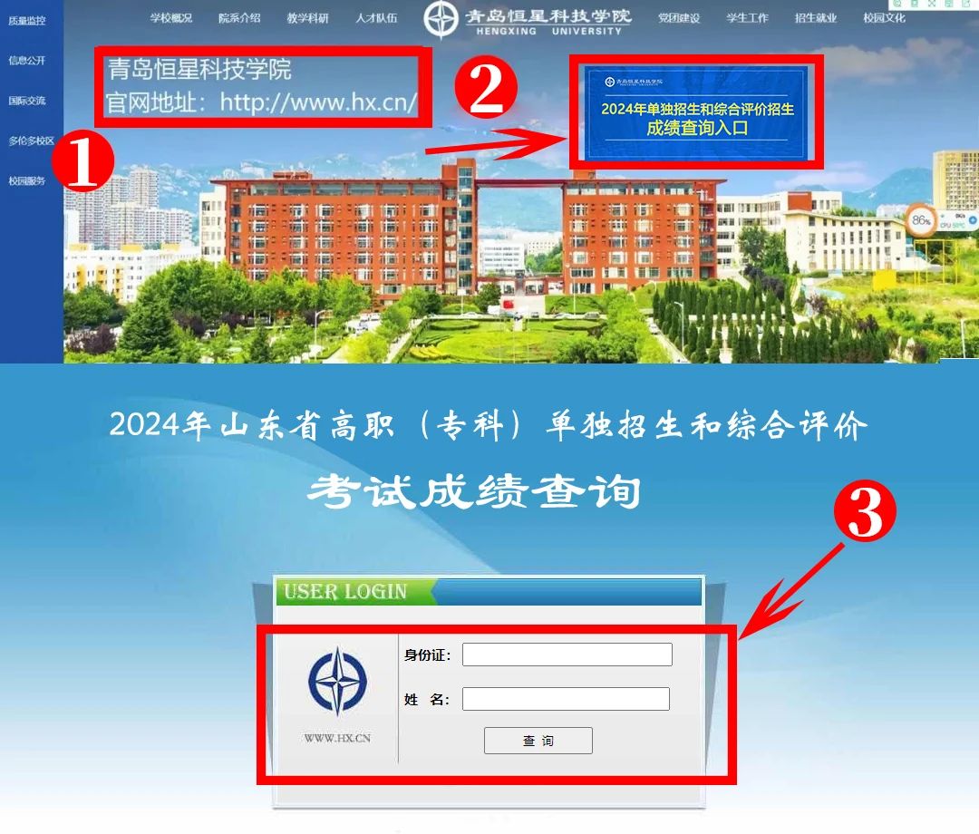 登录青岛恒星科技学院官网(http://www.hx.cn/)--点击飘窗--输入“姓名”和“身份证号”--查询