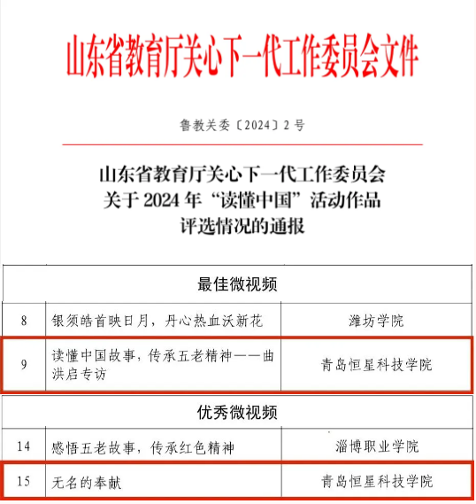 近日,山东省教育厅关工委公布了2024年“读懂中国”活动作品获奖名单,青岛恒星科技学院选送的微视频作品《读懂中国故事,传承五老精神——曲洪启专访》(作者:赵鑫妍张浩煜纪玉轩苏海文贾礼涛指导老师:杨皓)荣获最佳微视频奖,微视频作品《无名的奉献》(作者:于瑞赵浩良解滨娜毕玄指导老师:徐厚强)荣获优秀微视频奖。