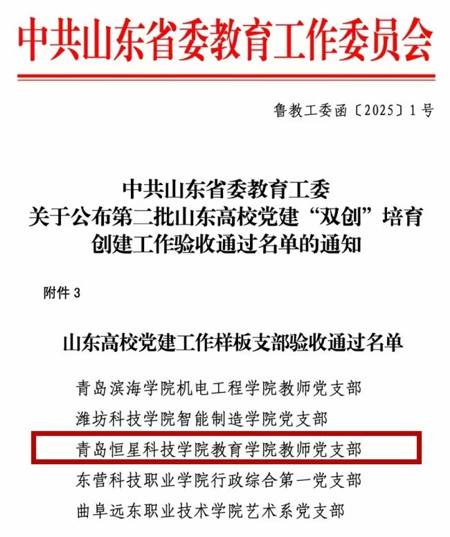 2025年,青岛恒星科技学院教育学院教师党支部顺利通过山东省委教育工委“山东党建工作样板支部”验收。自2021年11月申报山东省党建工作样板支部以来,教育学院教师党支部紧紧围绕立德树人根本任务,对标创建申报目标与内容,持续打造“倾情育火种,共筑幼教梦”的党建品牌。2022年顺利获批山东省党建工作样板支部创建单位,经过3年的建设培育,2025年顺利通过验收。