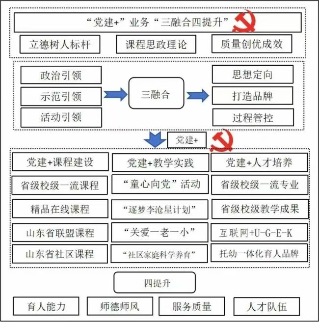 青岛恒星科技学院教育学院教师党支部坚决贯彻落实党中央、山东省委和校党委关于基层党建各项工作任务的部署要求,以强化基层党组织建设为核心,以创建标准化党支部为抓手,打造“倾情育火种,共筑幼教梦”的党建品牌,深入探索“行校共建,产教融合”的托幼一体化应用型人才培养路径,坚持“党建与业务”相融相促,同频共进,注重发挥党支部和党员在思政工作中的战斗堡垒和先锋模范作用,在教学、科研、管理、服务等领域取得了显著成绩。