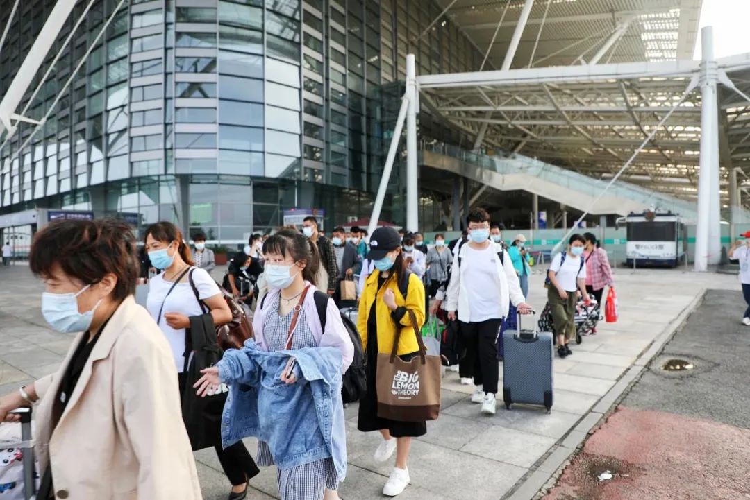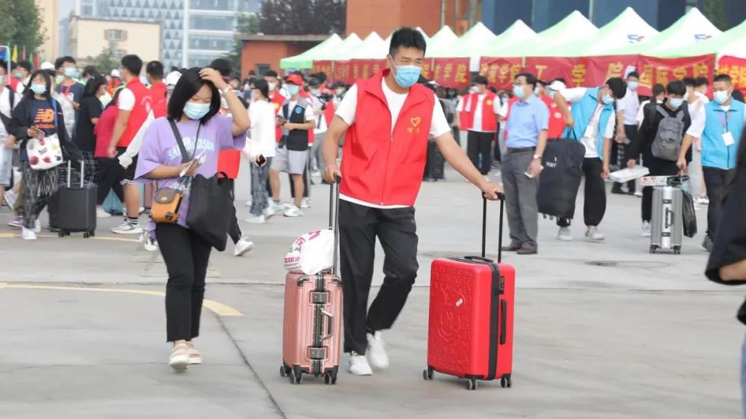 有选择托运的新生,也有选择独自体验的,他们拎着行李走在去往公寓的路上,欣赏着沿途的校景,身边还有志愿者们的陪伴。