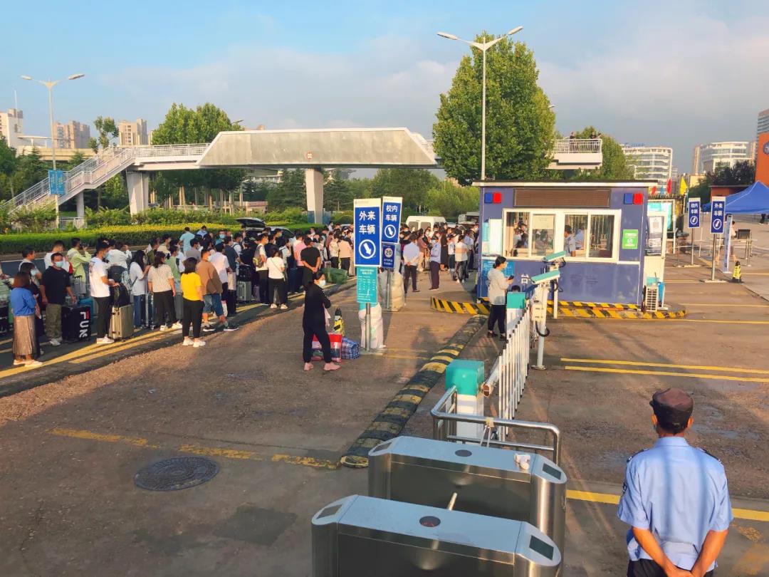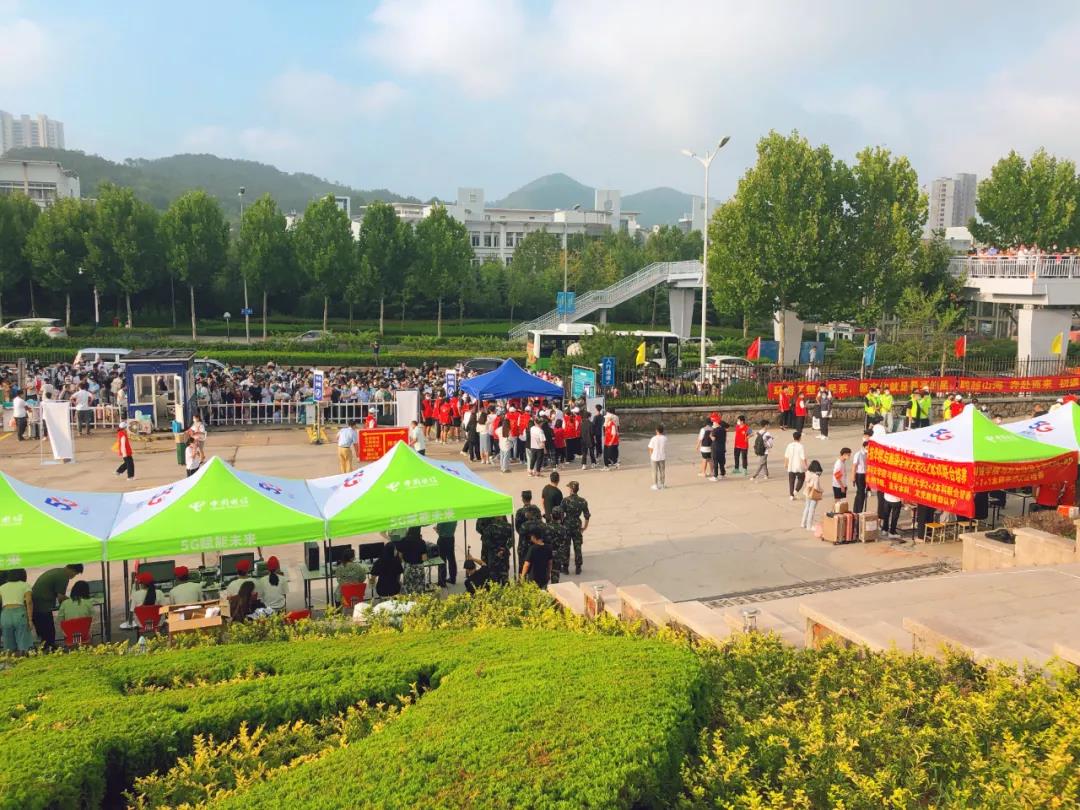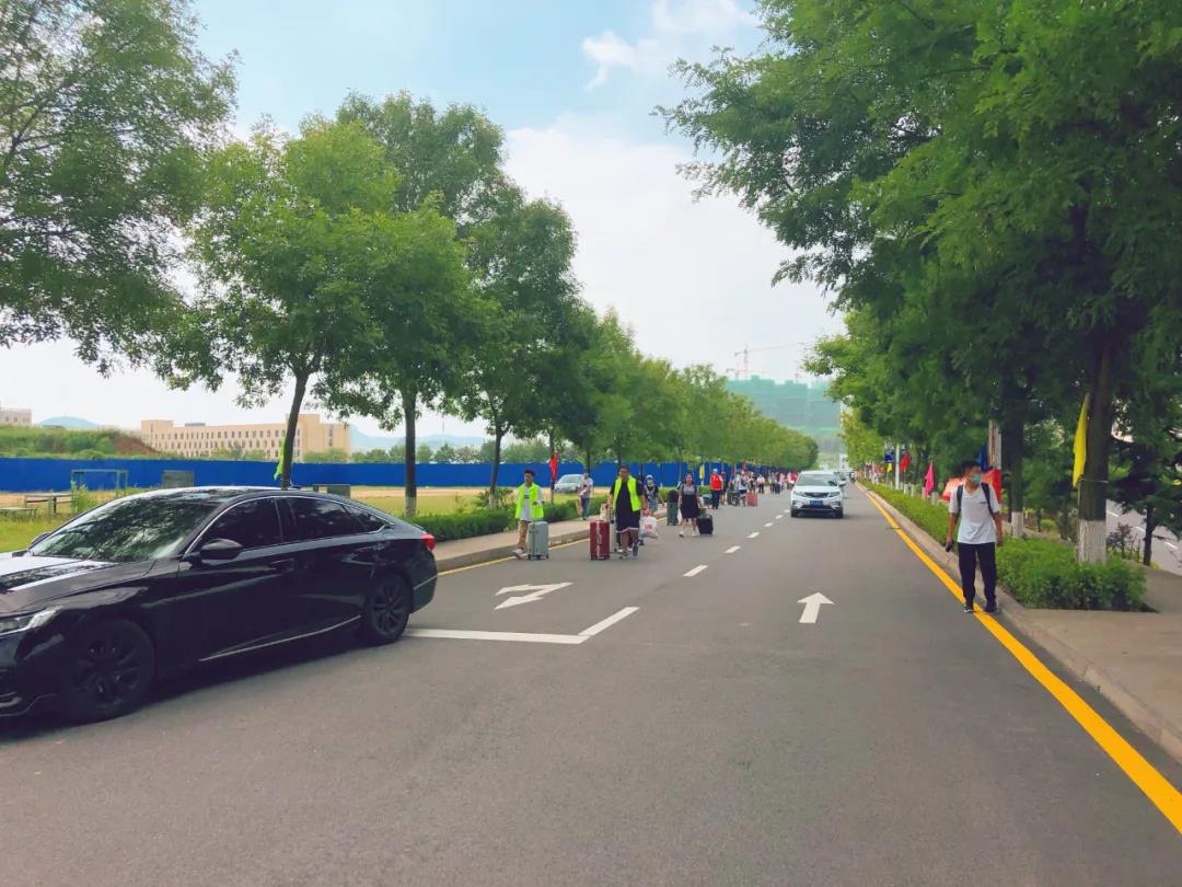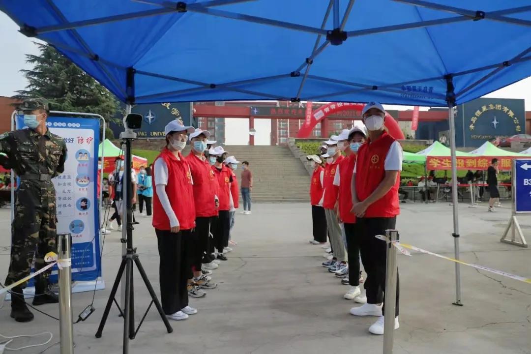 六点之前,学校负责接待的老师和志愿者们就到达接待现场,2021级新生和家长们也早早的在学校南门整齐排队等待入校。