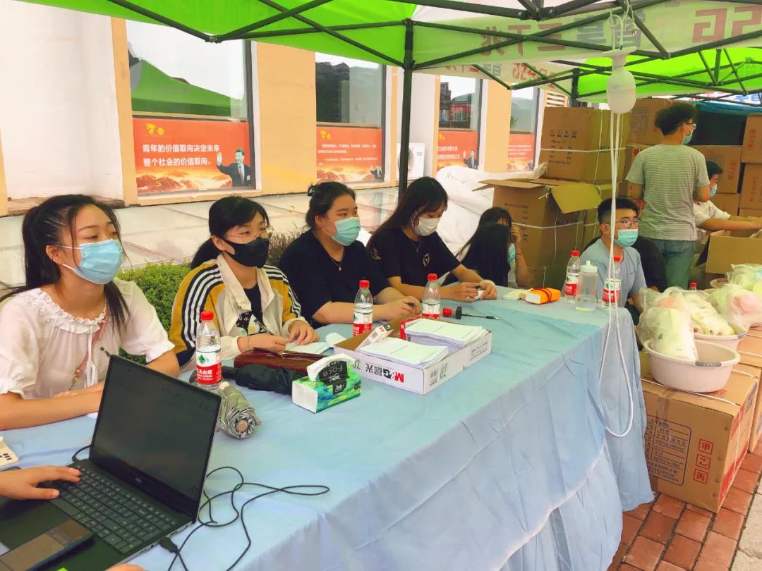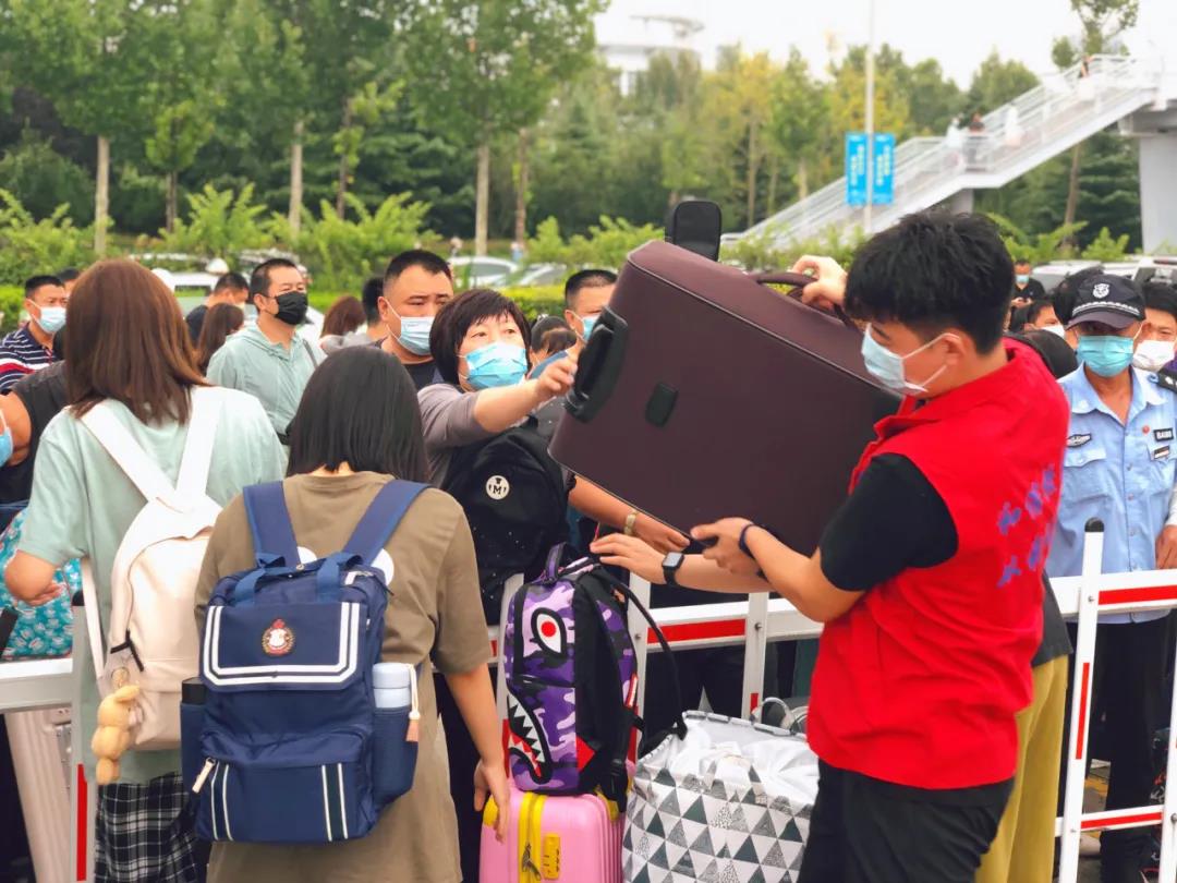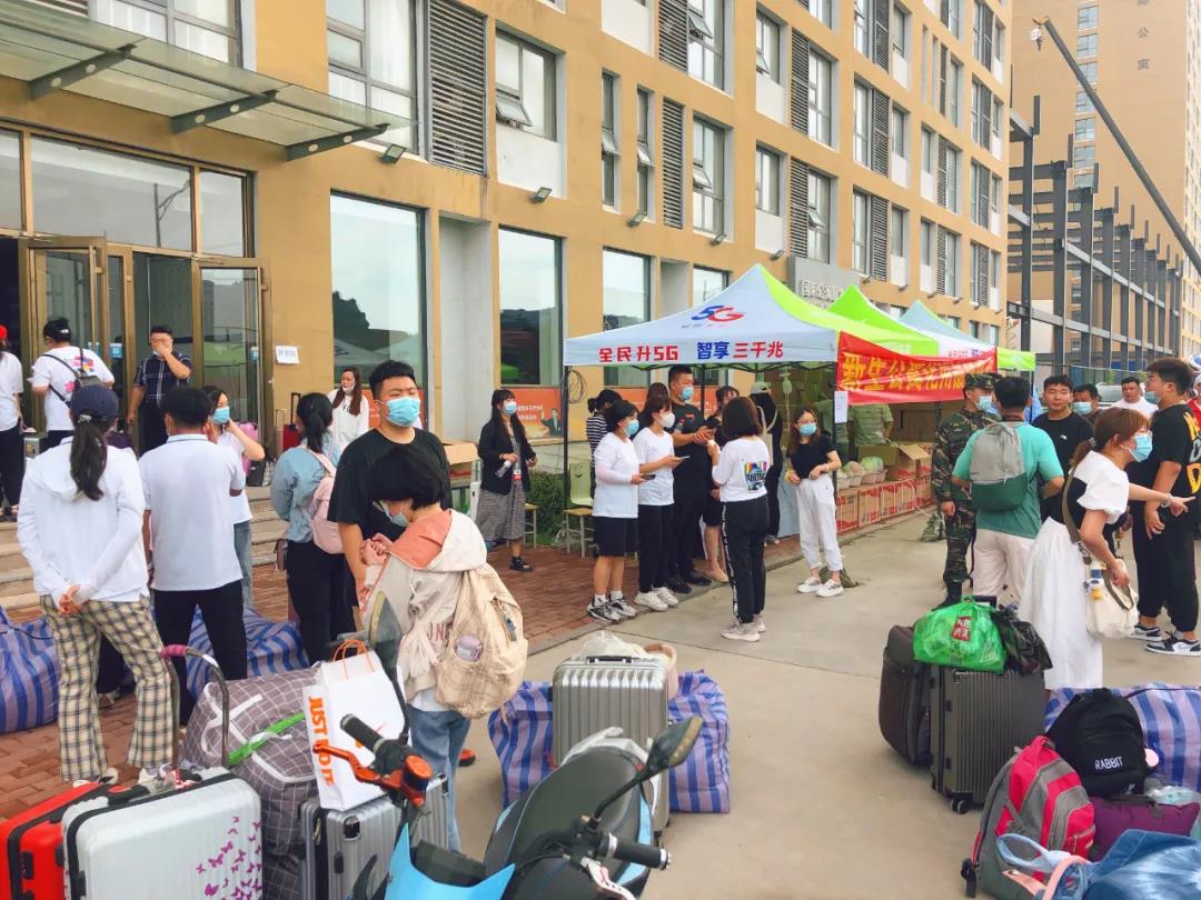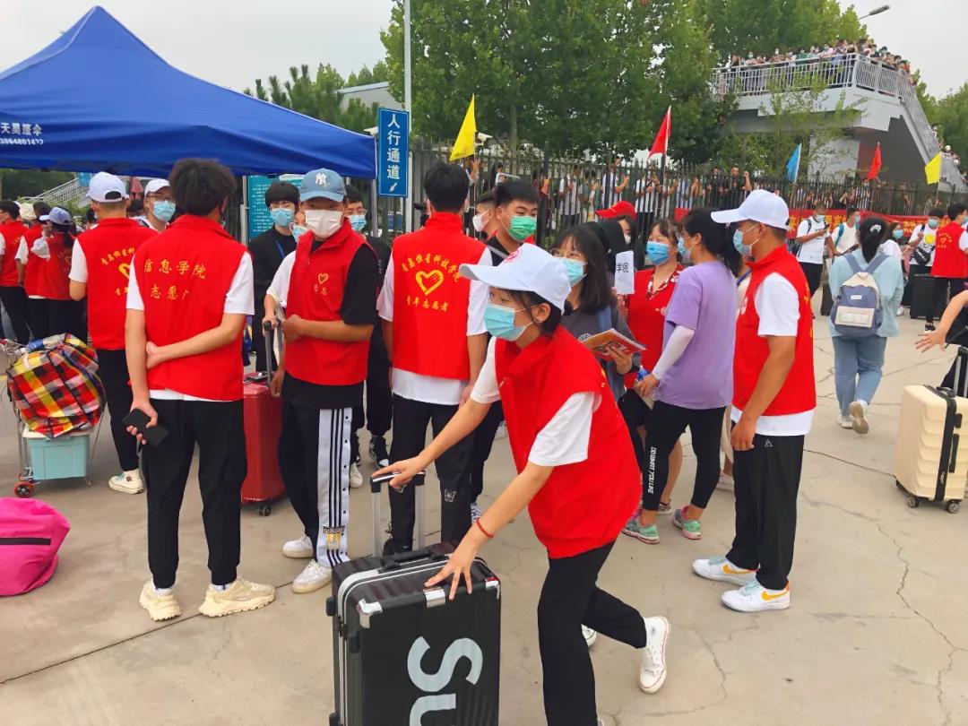 为了保障疫情期间入学工作的安全有序,志愿者们接过学弟学妹们的行李,并悉心指导新同学做好疫情期间的打卡和防护任务。