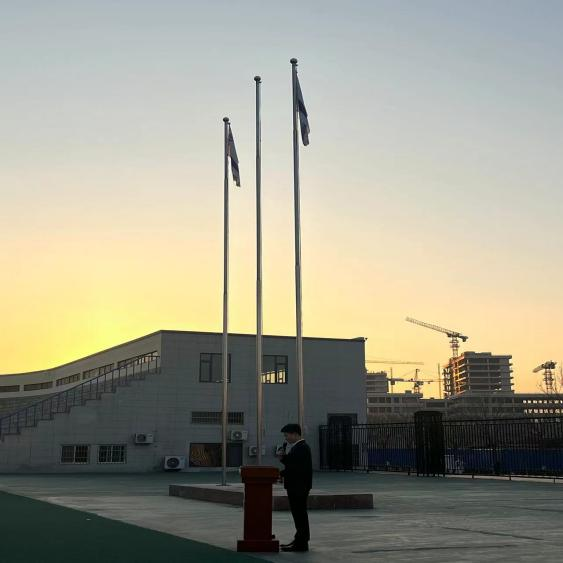 上午7时,升旗仪式正式开始。国旗护卫队队员迈着整齐有力的步伐走向升旗台。鲜艳的五星红旗伴随着雄壮的国歌冉冉升起,全体师生庄严肃立、齐唱国歌,向国旗行注目礼。