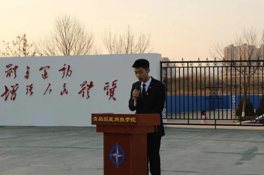 参加本次活动的有青岛恒星科技学院党委副书记、执行校长徐爱民教授、张王庚教授、质评处刘良好、学生发展处钱同新、旅游管理学院院长王伟、旅游管理学院党总支书记、执行院长郭宇锋及旅游管理学院全体师生。升旗仪式由旅游管理学院学团主席侯林酉同学主持。