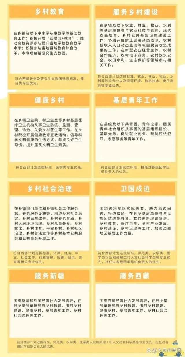 该项计划从2003年开始实施,按照公开招募、自愿报名、组织选拔、集中派遣的方式,每年招募一定数量的普通高等学校应届毕业生或在读研究生,到西部基层开展为期1-3年的教育、卫生、农技、扶贫等志愿服务。