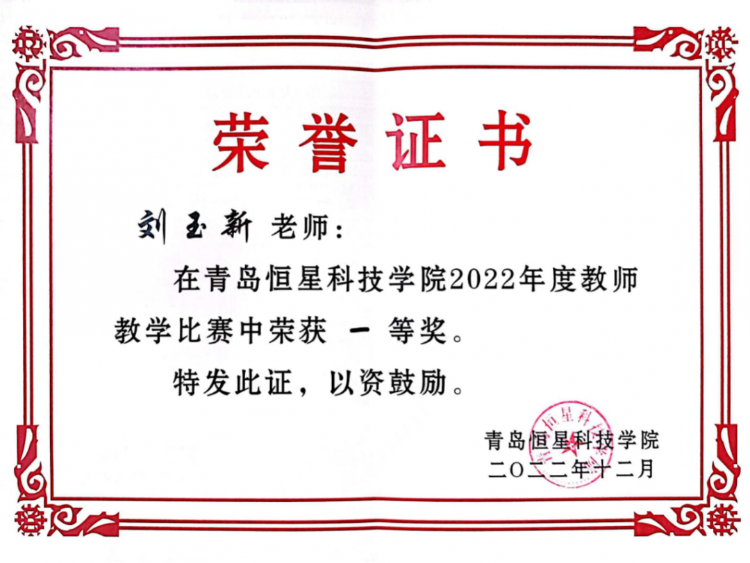 2022年12月2日星期五下午,青岛恒星科技学院教学比赛决赛在A8-110教室举办,教育学院数学教研室刘玉新老师以全场最高分91分的好成绩荣获一等奖。