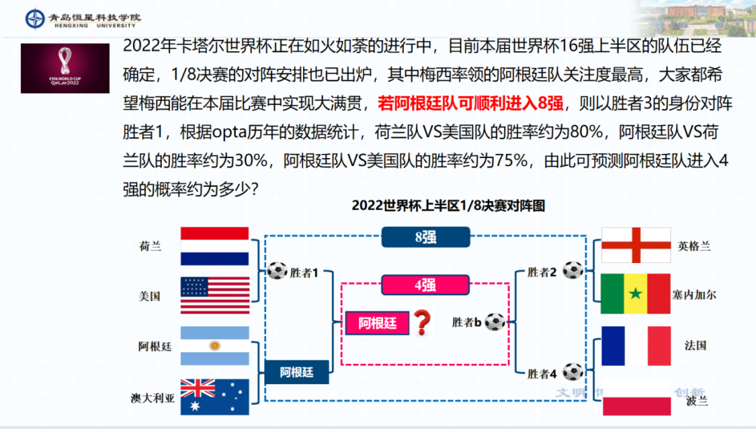 刘老师还联系当下正在亚洲国家卡塔尔如火如荼举办的世界杯,用全概率公式计算已经进入16强的阿根廷队进入本届世界杯4强的概率,引人入胜,获得评委老师的一致好评。最终刘老师以91分获得全场最高分,荣获本次教学比赛决赛的一等奖!