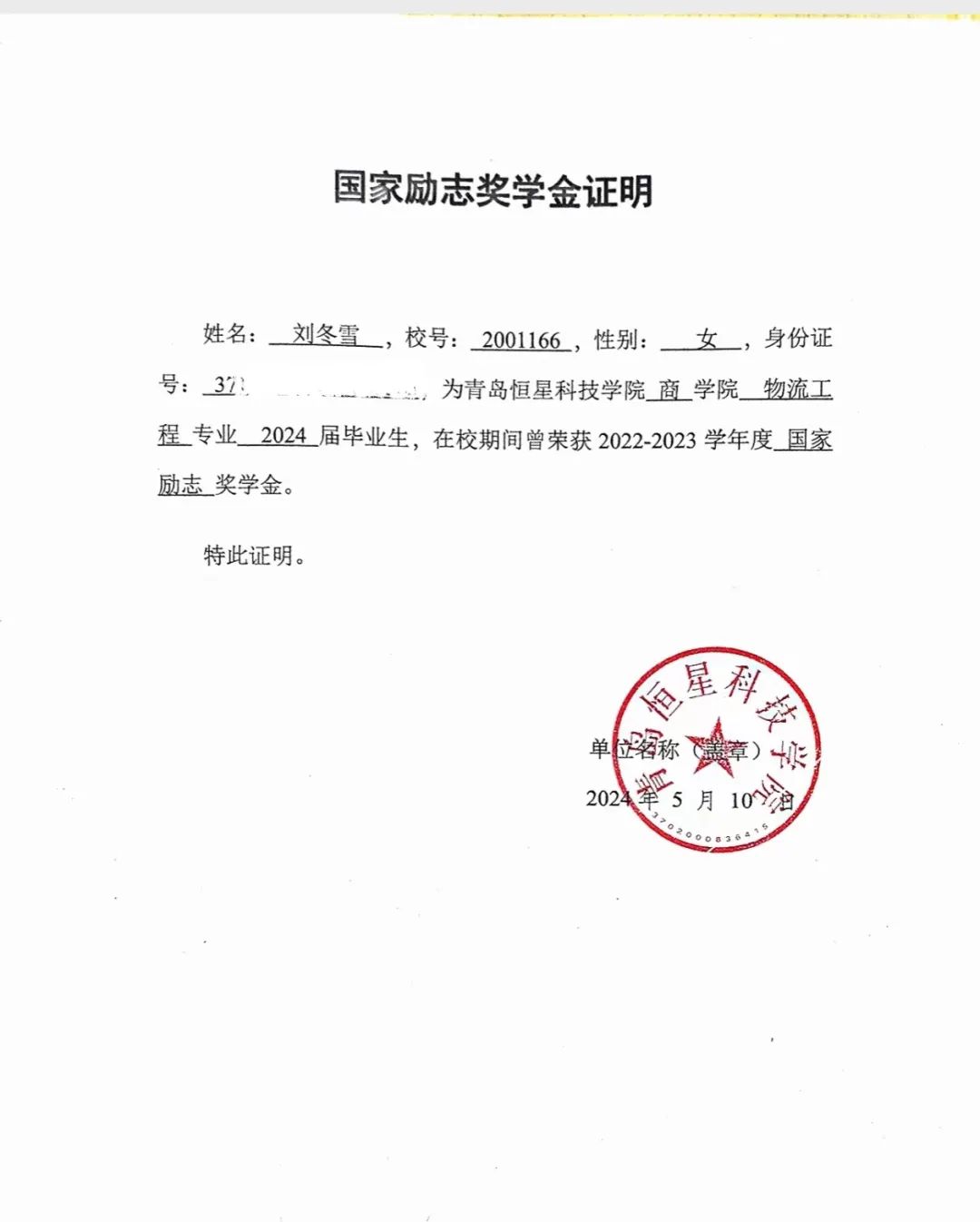 连续两年获得国家励志奖学金