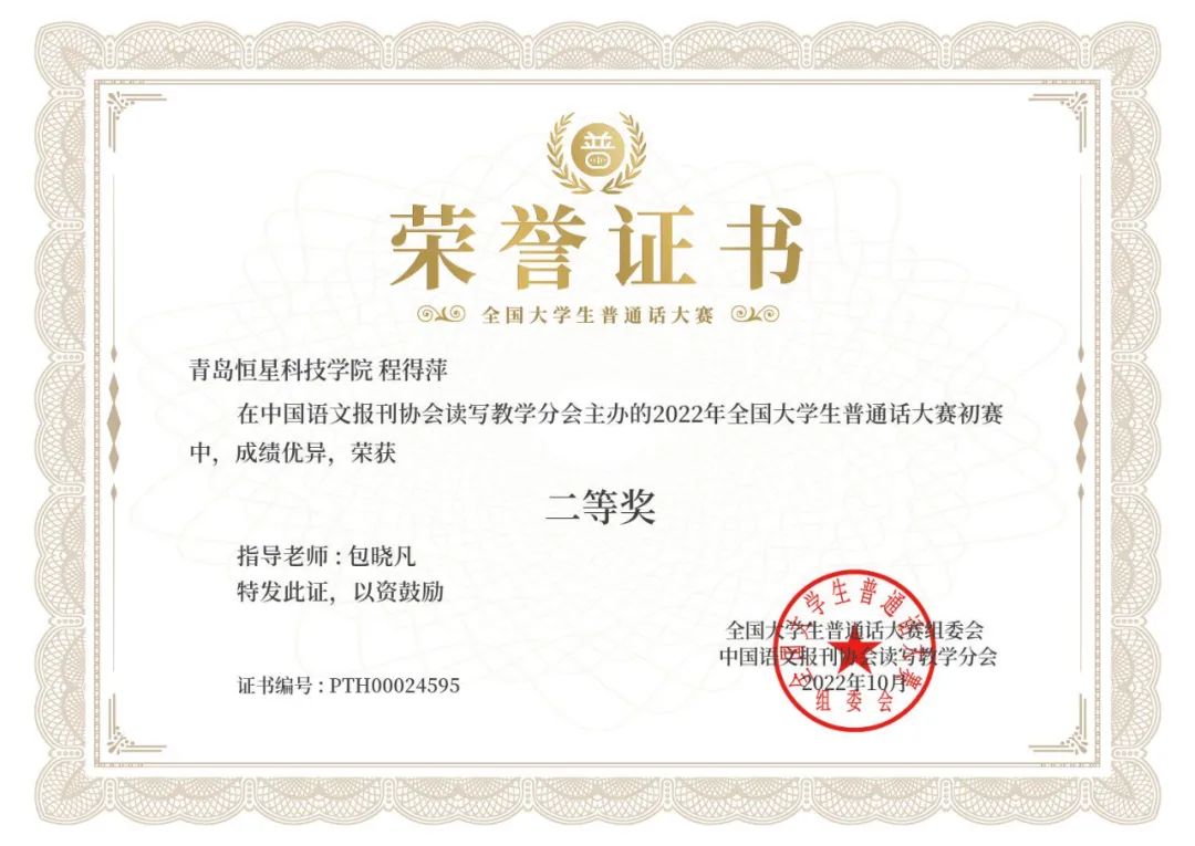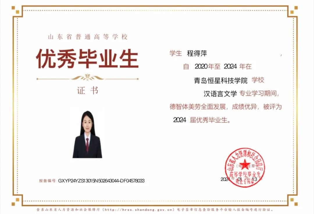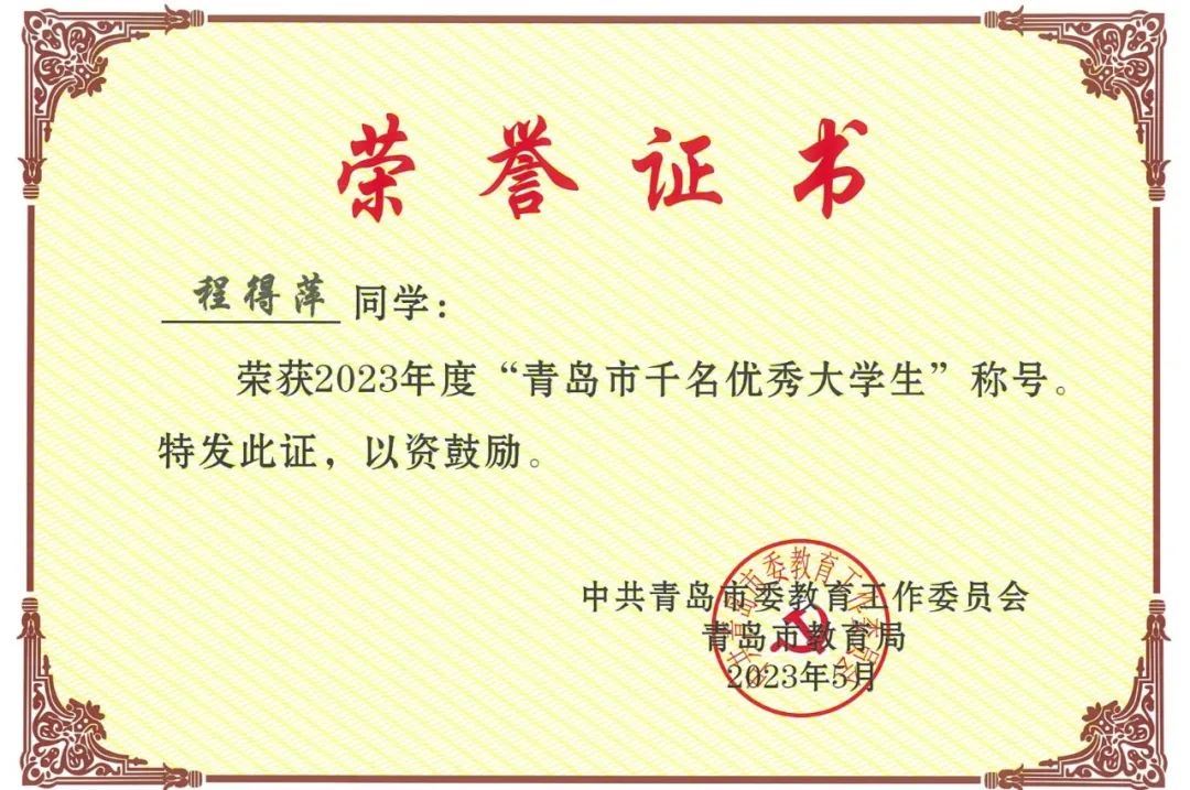 程得萍,人文学院2020级汉语言文学专业,中共预备党员,学习成绩年级第一,综合素质测评年级前十,获得国家奖学金、励志奖学金等诸多奖项,先后被评为山东省高等学校“优秀毕业生”、青岛市“千名优秀大学生”“学习之星”“优秀学生干部”等,获大赛奖项二十余项,曾任青峰书院学生联合会主席。
