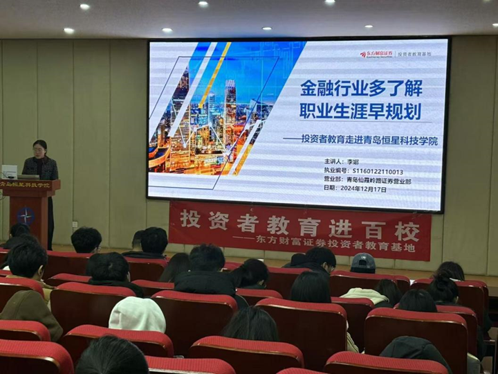 东方财富青岛营业部工作人员接着从长期投资、资产配置、波段操作等方面向同学们介绍了股票投资策略,表示市场投资思路应适应当下市场,合理布局。同时工作人员告诉同学们任何投资都有风险,投资者在实施股票投资时,要根据自身的风险承受能力和投资目标,应充分认识到其风险,做到理性投资,进行合理的资产配置,避免盲目跟风。鼓励同学们掌握金融基础知识,增强金融安全意识,提高金融素养和社会化能力。