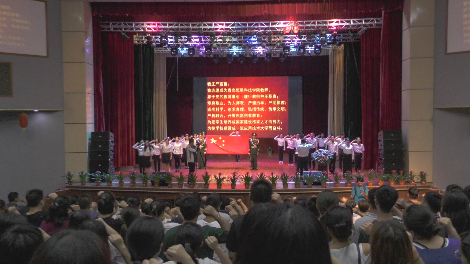 随后,全体教师在校长助理韩伟同志的带领下重温教师誓词,面向国旗庄严宣誓,忠于党的教育事业,履行教师的神圣职责,修身敬业,为人师表,严谨治学,严明执教,崇尚科学,追求真理,弘扬传统文化,传承文明,产教融合,开展创新创业教育,为把学生培养成国家建设栋梁之才而努力,为把学校建设成一流应用技术大学而奋斗!