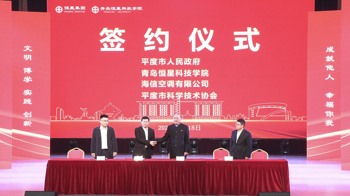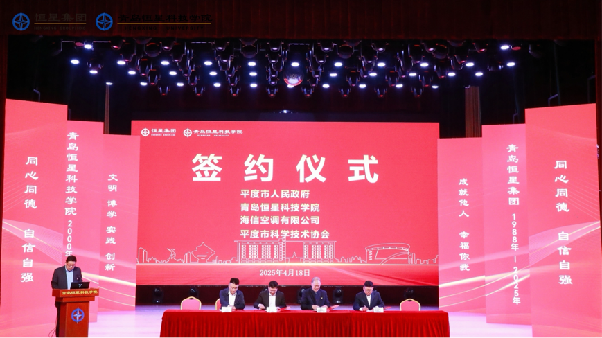 2025年4月18日上午,青岛恒星科技学院在学校国际交流中心与平度市人民政府、海信空调有限公司、平度市科学技术协会举行“政校企协”四方联动合作签约仪式。平度市人民政府副市长、党组成员谢仲鹏,海信空调有限公司总经理王庆玉,平度市科学技术协会副主席隋志强,青岛恒星科技学院党委副书记、校长毕宪顺等领导作为各方代表签约。签约仪式由青岛恒星科技学院党委委员、副校长韩伟主持。