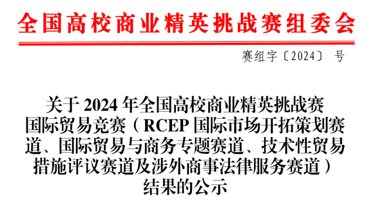 近日,2024年全国高校商业精英挑战赛国际贸易竞赛(RCEP国际市场开拓策划赛道、国际贸易与商务专题赛道、技术性贸易措施评议赛道及涉外商事法律服务赛道)全国总决赛圆满落幕。我校3支参赛队伍凭借出色的表现,在众多参赛队伍中脱颖而出,荣获国家二等奖2项、国家三等奖1项,同时我校获得最佳院校组织奖。