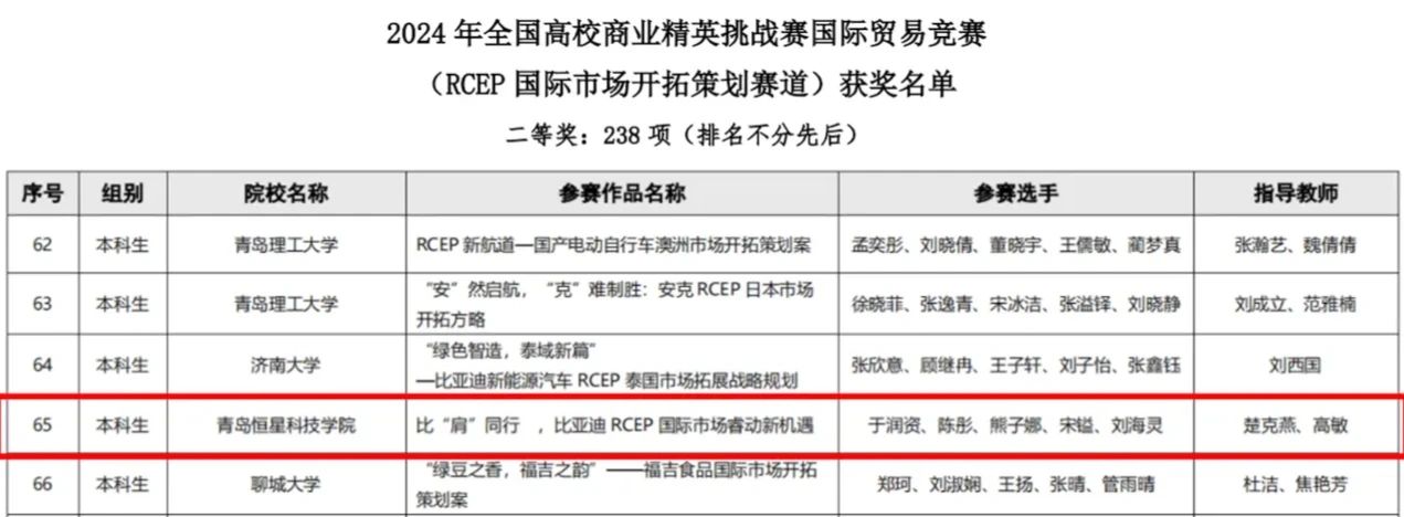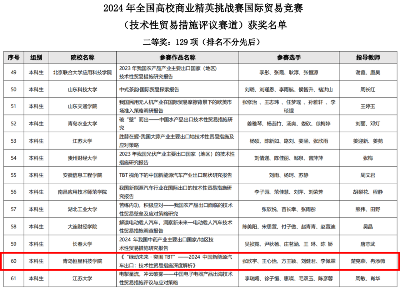 全国高校商业精英挑战赛国际贸易竞赛分为四个竞赛赛道,分别是:RCEP国际市场开拓策划赛道、国际贸易与商务专题赛道、技术性贸易措施评议赛道及涉外商事法律服务赛道。我校学生凭借扎实的专业知识和卓越的实践能力,并结合当前国际贸易形势和市场需求,进行深入分析研究,以高质量的参赛作品参与国赛角逐,在参与的三个赛道中均荣获国家级奖项。