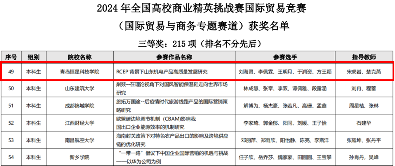 此次竞赛佳绩的取得,离不开学校的大力支持和指导教师的悉心指导,更离不开参赛学生的努力拼搏。近年来,我校不断加强国际商贸专业建设,积极推进实践教学改革,将学科建设与数字技术相融合,通过“竞赛指导+数贸融合”组织学生参加各类学科竞赛,提升学生的综合素质和创新能力,以赛促学,为一流本科专业建设做好铺垫之路。未来,学校将继续以学科竞赛为抓手,进一步深化教育教学改革,培养更多适应新时代发展需求的高素质国际经贸人才。