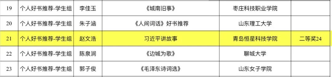 青岛恒星科技学院教育学院赵文浩荣获书香山东·阅读风采个人好书推荐(学生组)二等奖,人文学院薛锦堉荣获书香山东·阅读风采个人好书推荐(学生组)三等奖。