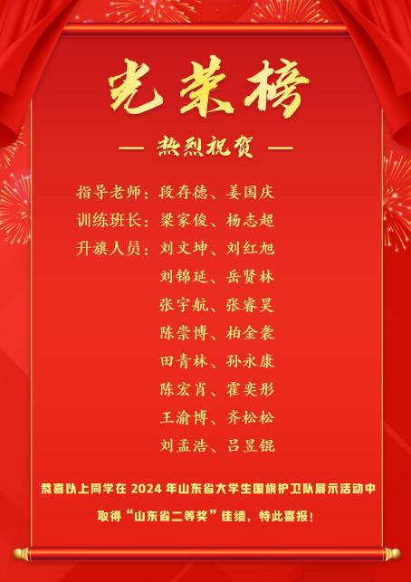 近日,2024年山东省大学生国旗护卫队展示活动落下帷幕。我校国旗护卫队凭借非凡的表现成功荣获二等奖,全方位展现出当代大学生朝气蓬勃、积极向上的精神风貌,为学校的荣誉勋章再添璀璨光芒。
