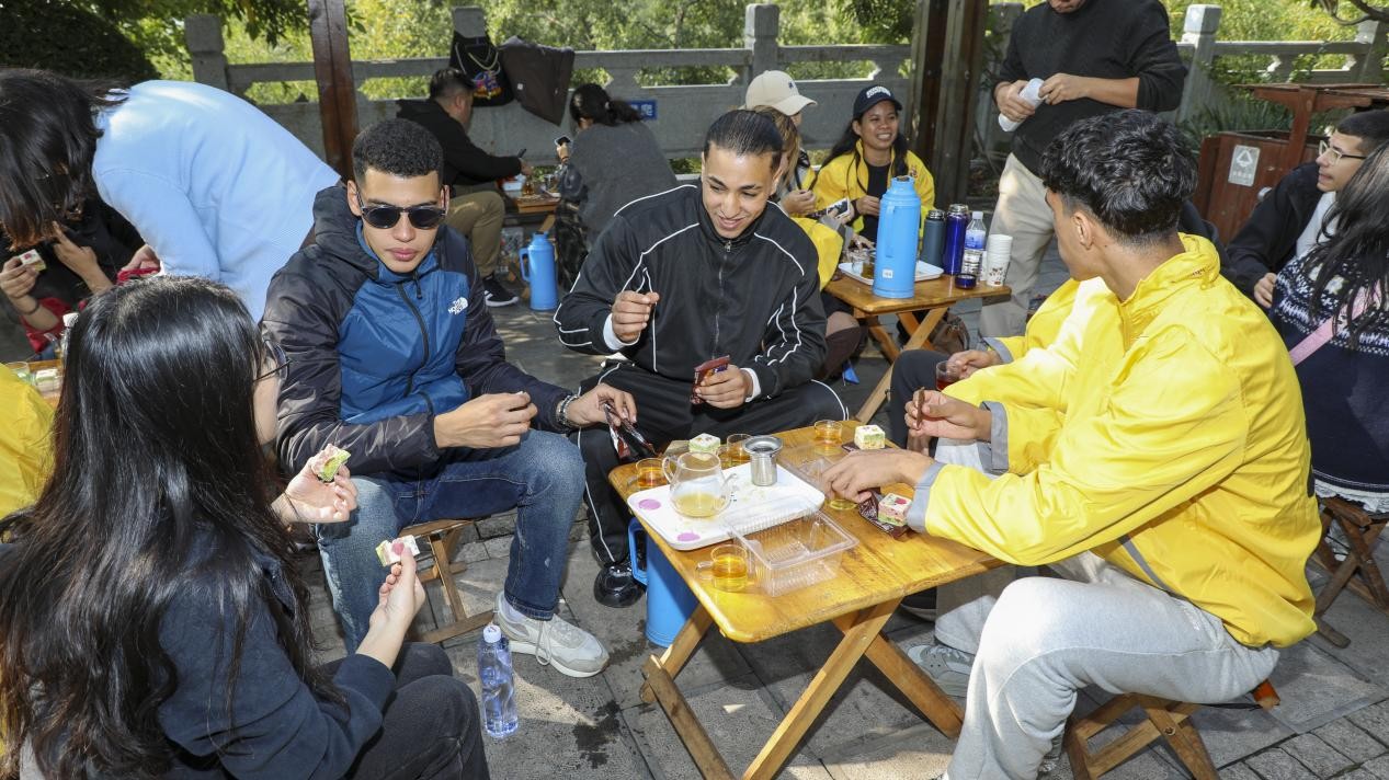 活动最后,参与者品尝了重阳糕,了解其“步步高升”的寓意。在品尝过程中,大家互相交流着各自国家的传统节日和习俗,分享着节日的喜悦和文化的交融。