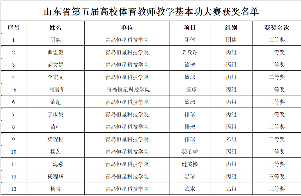 近日,山东省教育厅正式公布了《山东省第五届高校体育教师基本功大赛获奖名单》,我校体育学院参赛教师凭借扎实的专业基础和丰富的参赛经验在众多参赛队伍中脱颖而出,在团体、乒乓球、篮球、排球、足球、羽毛球、健美操、武术等项目中斩获13项大奖,充分展示出我校在体育领域的实力。