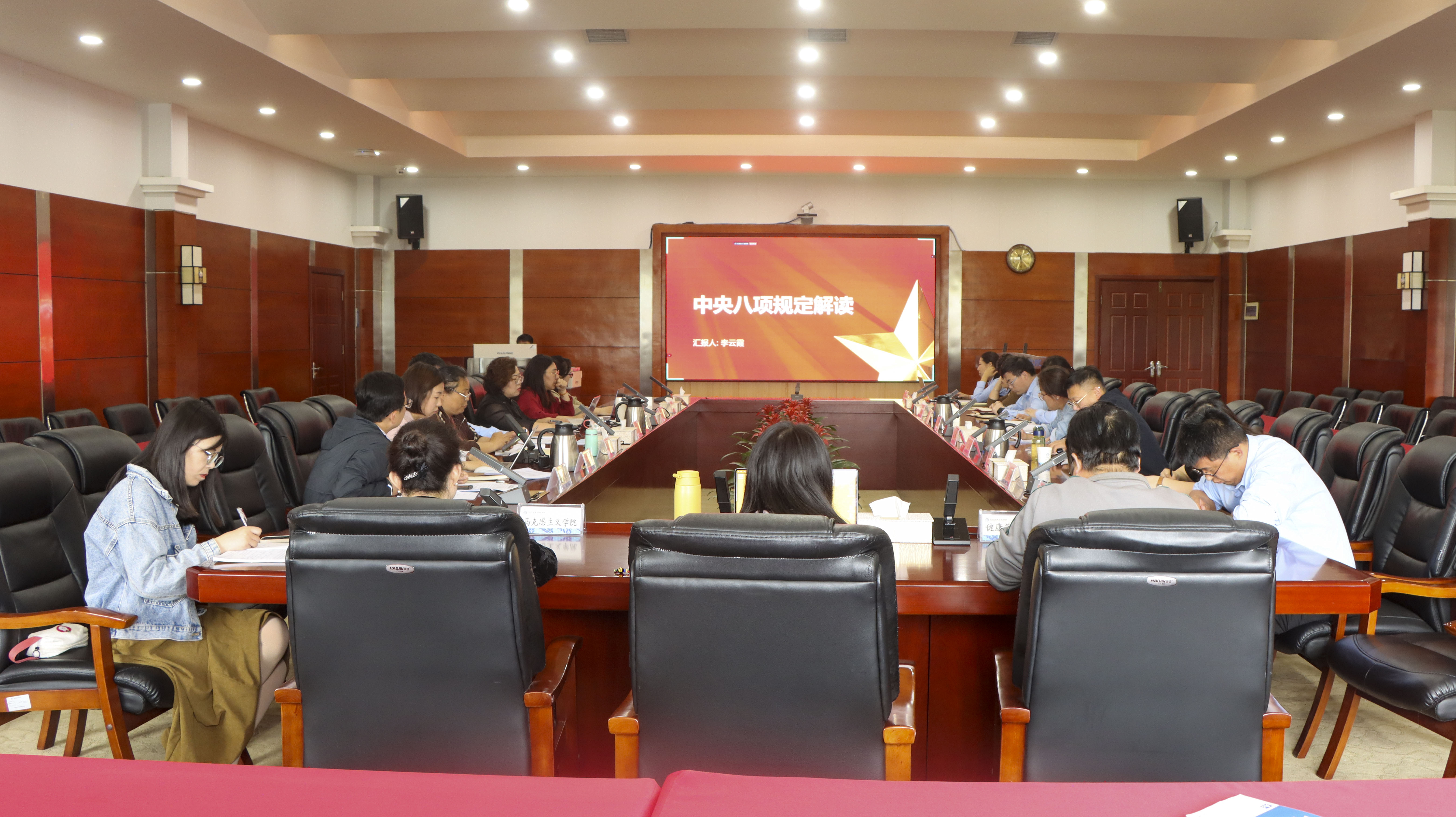 会上党委委员、纪委书记李云霞围绕中央八项规定的出台背景、重要意义、具体内容及实施成效等方面进行了全面而深入的解读。她指出,中央八项规定是加强党风廉政建设、密切联系群众、提高政府工作透明度和效率的重要举措,对于学校而言,同样是规范管理、改进作风、提升服务质量的行动指南。